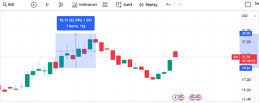 Un altro indicatore che può riflettere la paura all'interno del mercato azionario statunitense è il VIX. Questo indice misura la volatilità del mercato, ossia l’ampiezza delle variazioni previste nei prezzi delle azioni. Spesso definito come “l’indice della paura”, il VIX tende ad aumentare in periodi di incertezza o paura, come quelli legati a crisi economiche o politiche