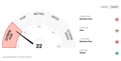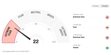 Il Fear and Greed è un indice che misura il livello di paura e avidità nel mercato, con valori che vanno da 0 (Estrema Paura) a 100 (Estrema Avidità). A fine marzo, l’indicatore ha toccato i 22 punti, entrando in zona di "Estrema Paura".