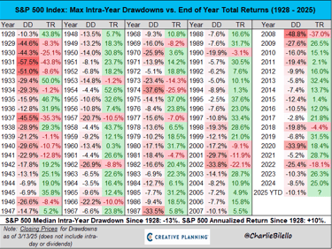 Le flessioni superiori al 10% nei mercati azionari sono abbastanza comuni; è il prezzo da pagare per ottenere rendimenti reali (al netto dell'inflazione) superiori a quelli delle tradizionali obbligazioni. Nel grafico sottostante si può osservare come, nonostante il mercato azionario statunitense abbia registrato un rendimento medio annuo del 10% dal 1928 al 2025, il drawdown (ovvero la perdita massima) medio annuale sia di circa il 13%.